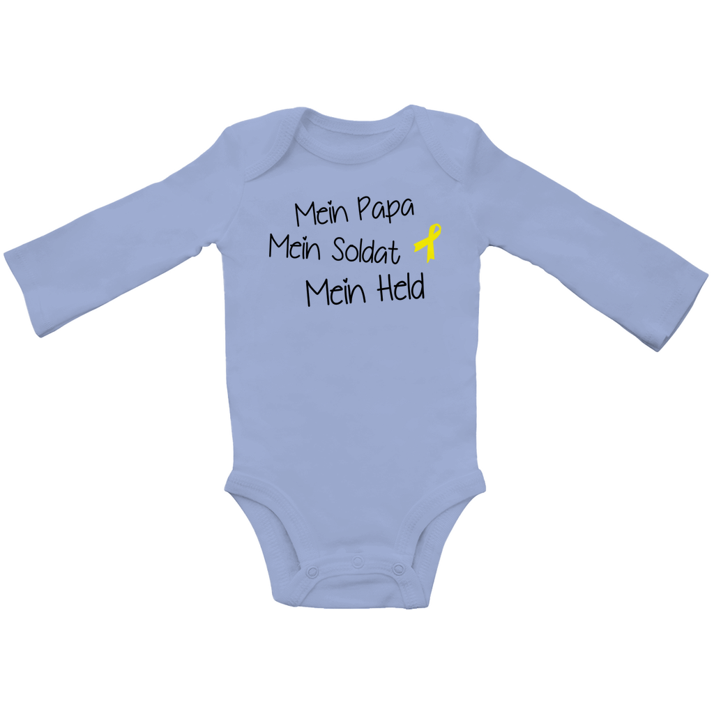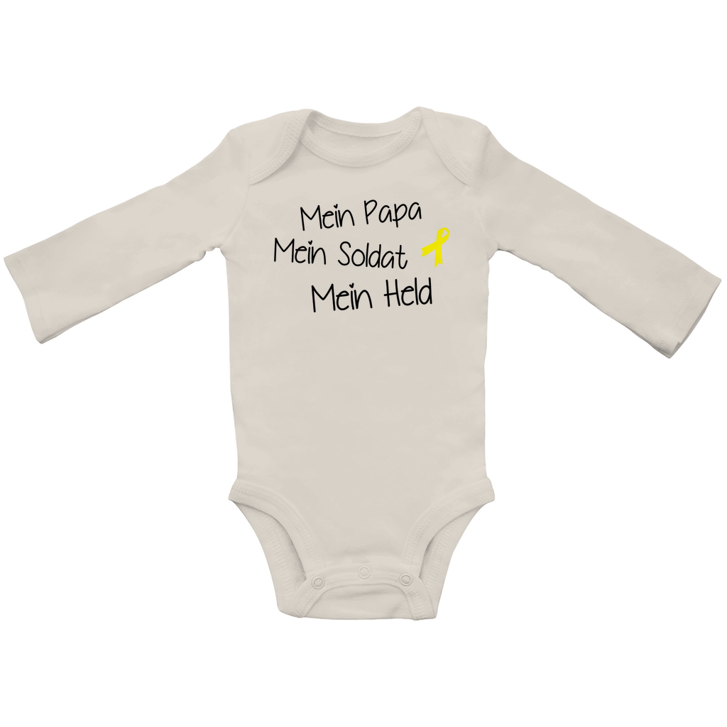 Dieser liebevoll gestaltete Babybody mit dem Aufdruck „Mein Papa, mein Soldat, mein Held“ ist mehr als nur ein Kleidungsstück – er ist ein Zeichen von Stolz und Verbundenheit.