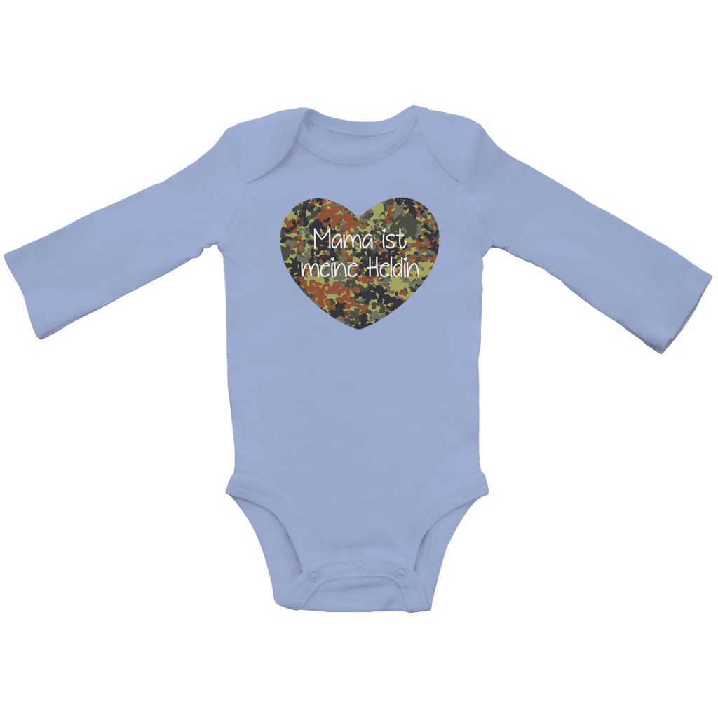 Dieser liebevoll gestaltete Babybody trägt eine ganz besondere Botschaft: „Meine Mama ist meine Heldin“, umrahmt von einem Herz im Flecktarnmuster. Perfekt für die Kinder von Soldatinnen, die voller Stolz und Liebe ihre Mama feiern.